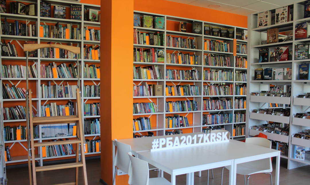 Читальный зал библиотеки оборудован стационарными металлическими стеллажами серии СА. На торцах линеек стеллажей установлены дизайн-панели из ЛДСП.