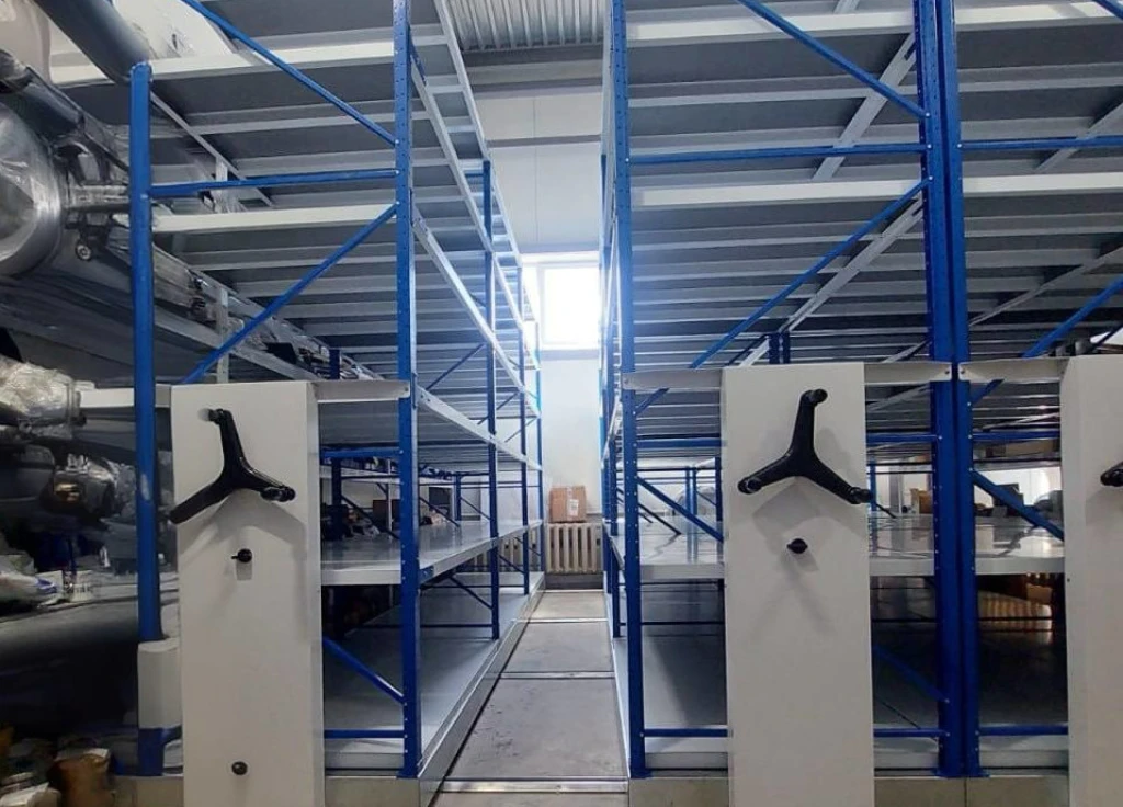 Металлические стеллажи с усиленной мобильной базой для хранения грузов общим весом до 350 кг на полку.